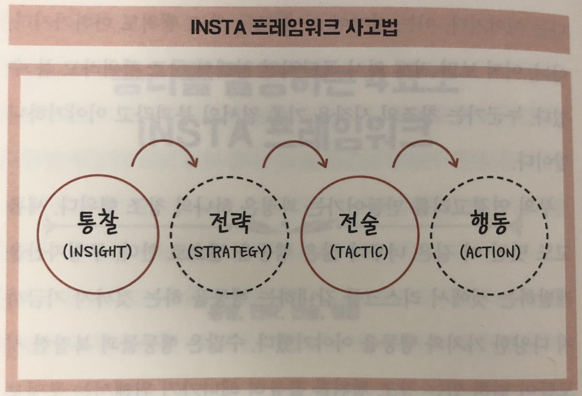 한 예로 책에서 소개된 INSTA 프레임워크 사고법에서 A에 해당하는 실행이 다소 부족하다고 생각했다. 따라서 머리 속에서만 되새김질 하면서 이거 하면 잘될 것 같은데? 라는 막연한 생각에서 그치는 것이 아니라 그 생각(통찰)이 실행시킬 수 있는 생각인지, 그만한 가치가 있는 행동일지를 판단(전략, 전술)하고 실행(행동)으로 확장시키는 연습을 하고 있다.
